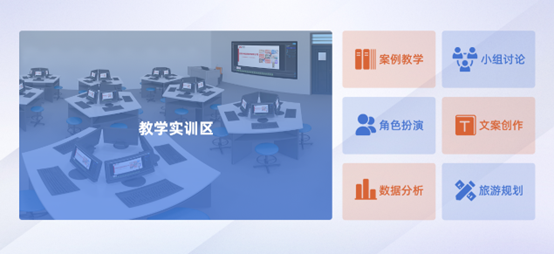 教學(xué)實(shí)訓(xùn)區(qū):提供沉浸式的智慧教學(xué)環(huán)境,支持多媒體教學(xué)和VR體驗(yàn),助力學(xué)生直觀感受旅游專業(yè)知識(shí),提升學(xué)習(xí)興趣和實(shí)踐能力。