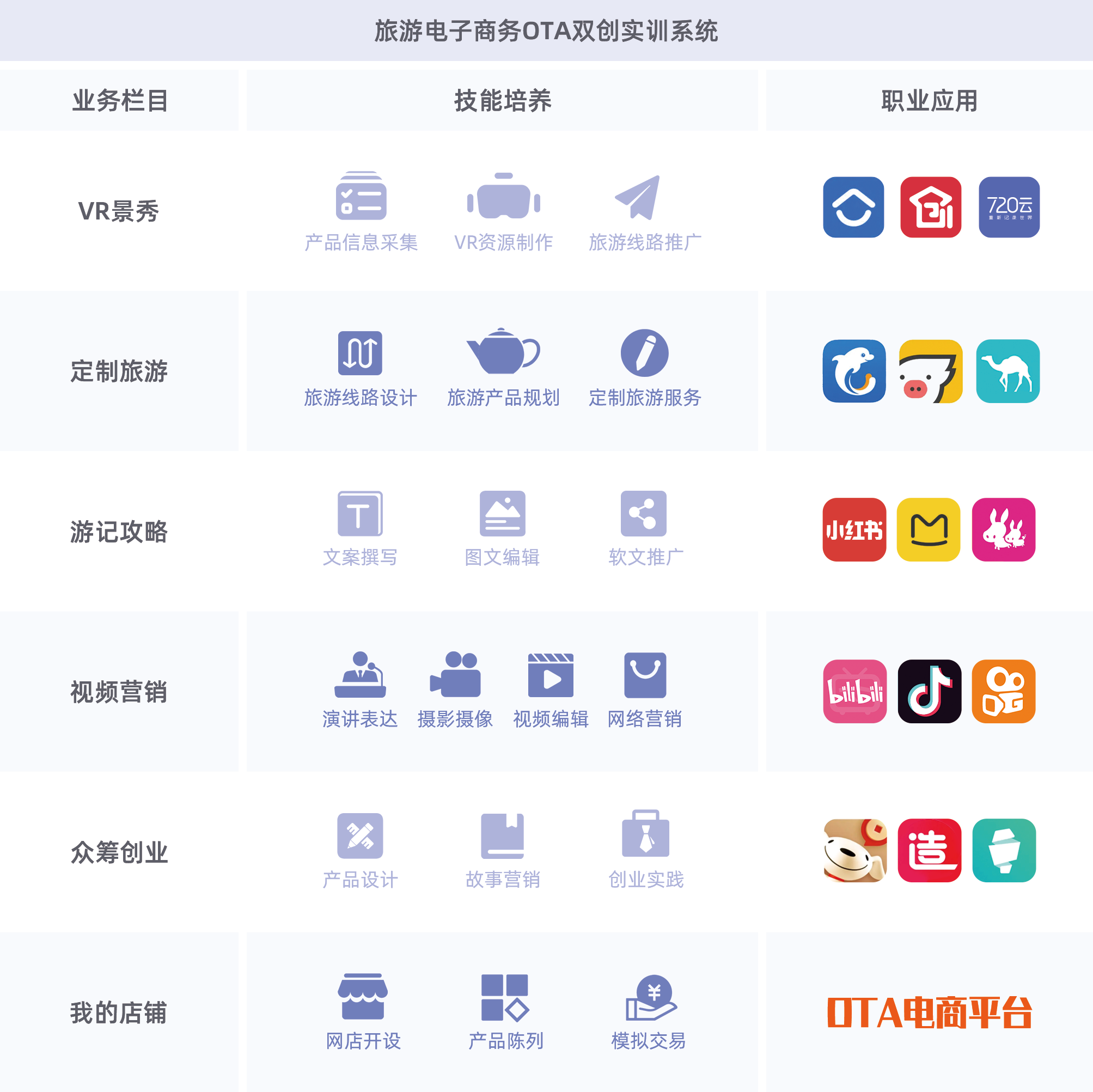 系統(tǒng)以當下熱門的旅游電商OTA業(yè)務(wù)模式、產(chǎn)品類型、市場應(yīng)用為基礎(chǔ),設(shè)置VR景秀、定制旅游、游記攻略、視頻營銷、眾籌創(chuàng)業(yè)和我的店鋪6個業(yè)務(wù)板塊,可開展旅游活動策劃、定制旅游服務(wù)、旅游線路設(shè)計、旅游文創(chuàng)產(chǎn)出、旅行社經(jīng)營與管理、旅游市場營銷等教學(xué)實踐活動。各欄目間互相聯(lián)系又彼此促進,學(xué)生既可以在特定欄目進行專項訓(xùn)練,又可以通過不同的欄目組合進行綜合提升。