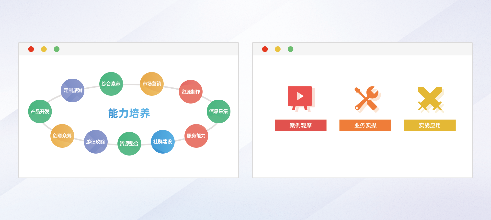 系統(tǒng)按照“案例觀摩-業(yè)務(wù)實操-實戰(zhàn)應(yīng)用”流程設(shè)置實訓(xùn)模塊,培養(yǎng)學(xué)生的旅游產(chǎn)品開發(fā)與資源整合能力、社群建設(shè)與服務(wù)能力、市場營銷能力、信息采集與運作等業(yè)務(wù)技能,通過全流程參與旅游產(chǎn)品及服務(wù)的生產(chǎn)、開發(fā)與經(jīng)營等活動,幫助學(xué)生找到自己的職業(yè)專長,提高創(chuàng)新創(chuàng)業(yè)實踐技能。