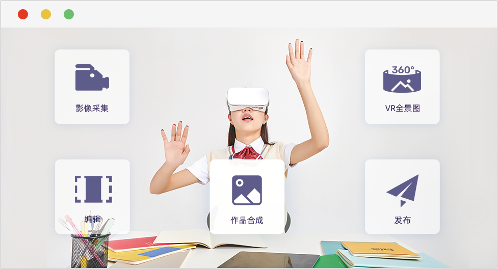 系統(tǒng)資源庫(kù)全面開放,原始圖片、VR影像、導(dǎo)航地圖、文本資料、音樂解說等資源均可自由調(diào)取應(yīng)用。學(xué)生也可利用教學(xué)軟件及采集工具、制作新的VR影像資源,創(chuàng)建自己的資源庫(kù)和線路產(chǎn)品。設(shè)計(jì)成果可在大屏幕、電腦、手機(jī)、平板、VR頭盔等多種終端進(jìn)行全媒體傳播。